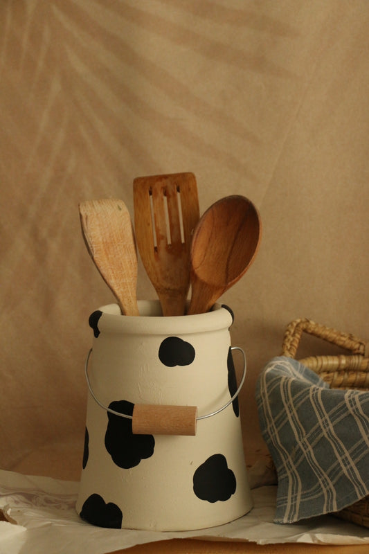 Büyük Boy Kulp Detaylı Kahve Çizgili El Yapımı Dekoratif Vazo & Kaşıklık