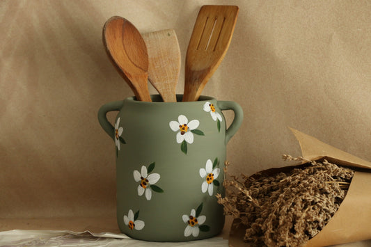 Hoyatap Dekoratif Çiçek Desenli El Yapımı Ve El Boyama Seramik Kulplu Vazo