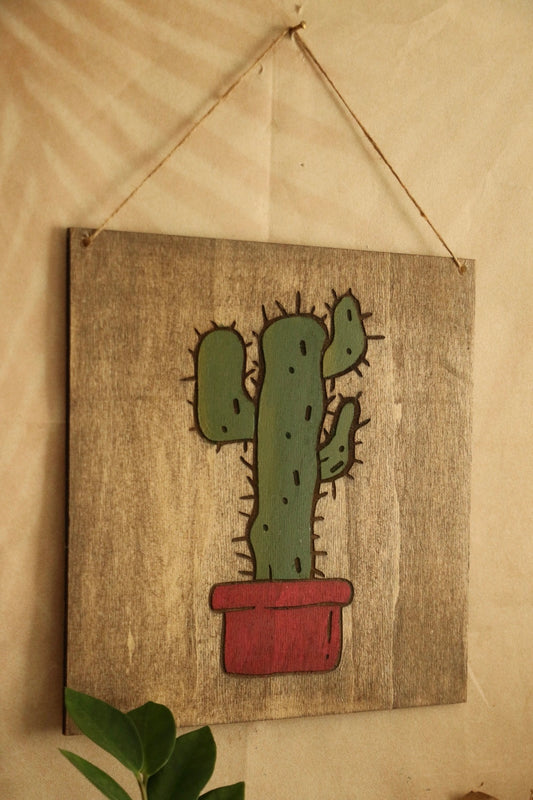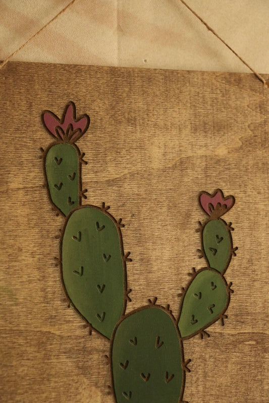 Hoyatap Ahşap Oyma Desenli Kaktüslü Rustik El Boyama Tablo