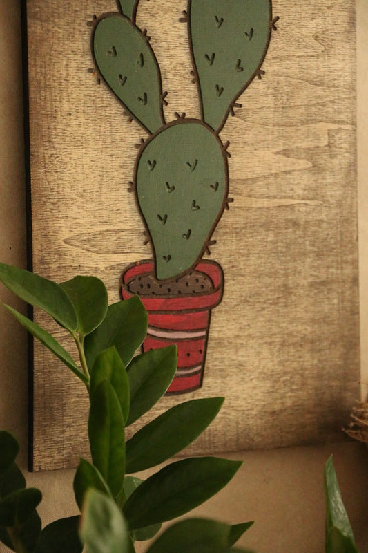 Hoyatap Ahşap Oyma Desenli Kaktüslü El Boyama Tablo
