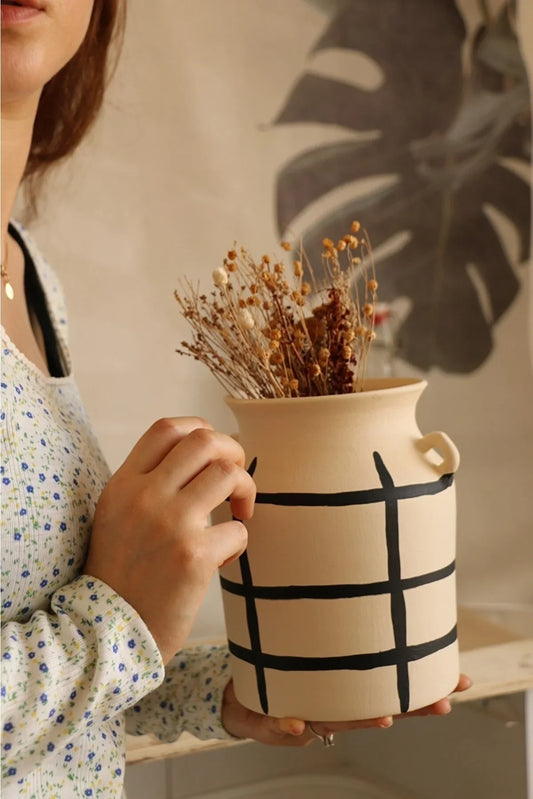 Hoyatap El Yapımı Çizgili Kulplu Seramik Büyük Vazo / Kaşıklık