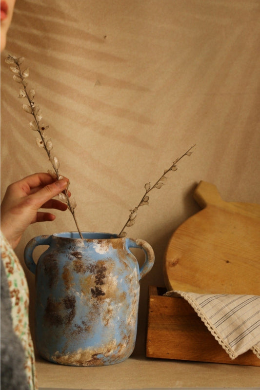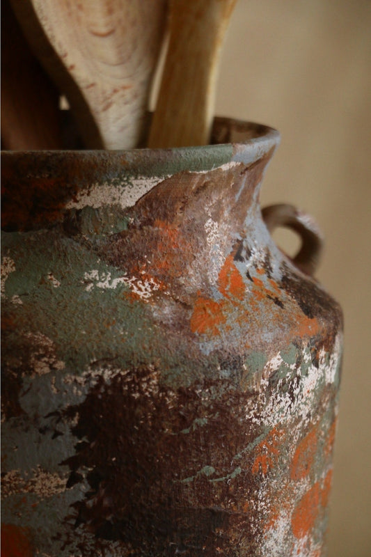 Hoyatap El Yapımı Ve El Boyama Eskitme Vintage Seramik Kulplu Vazo