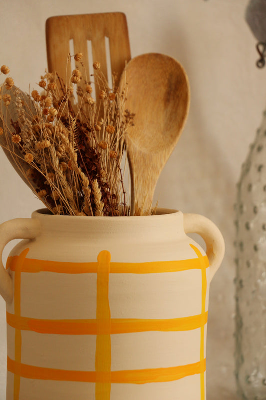 Hoyatap El Yapımı Kulplu Sarı Çizgili Seramik Vazo / Kaşıklık