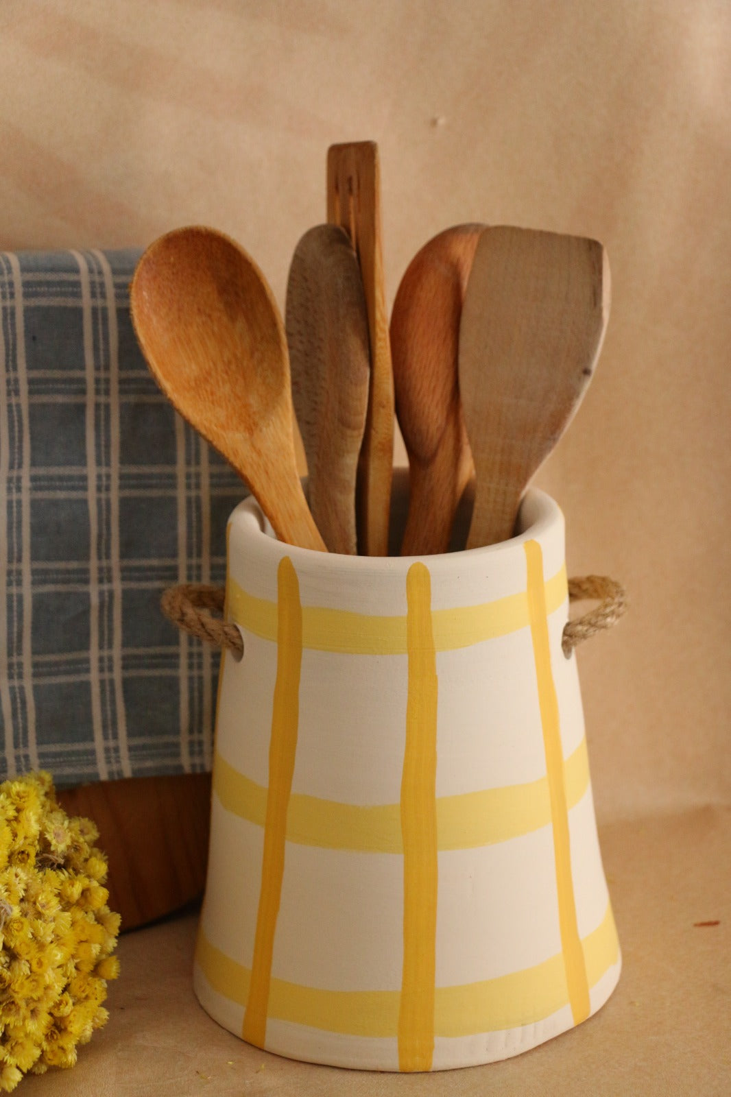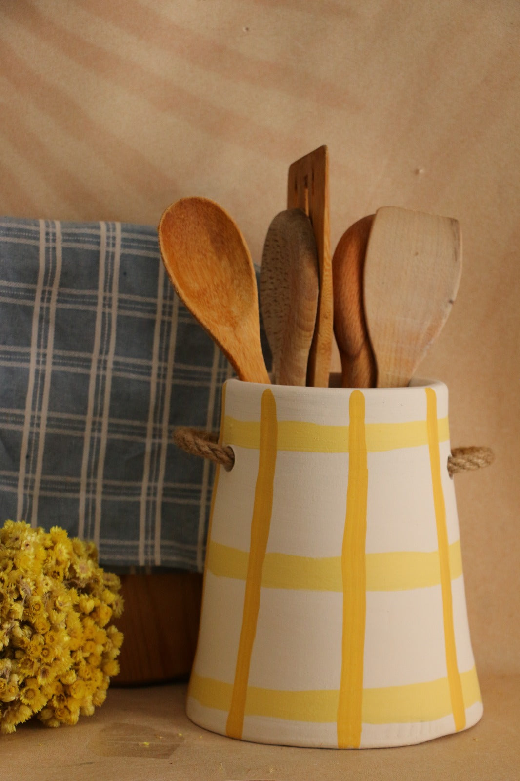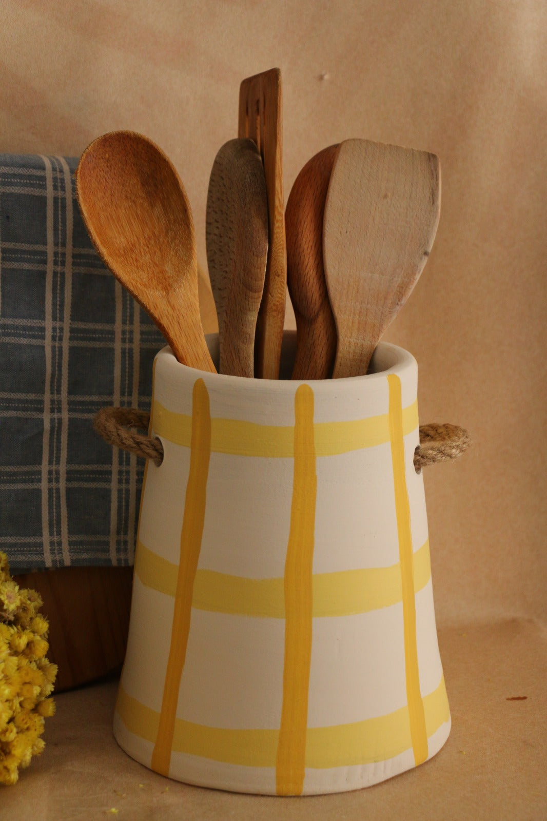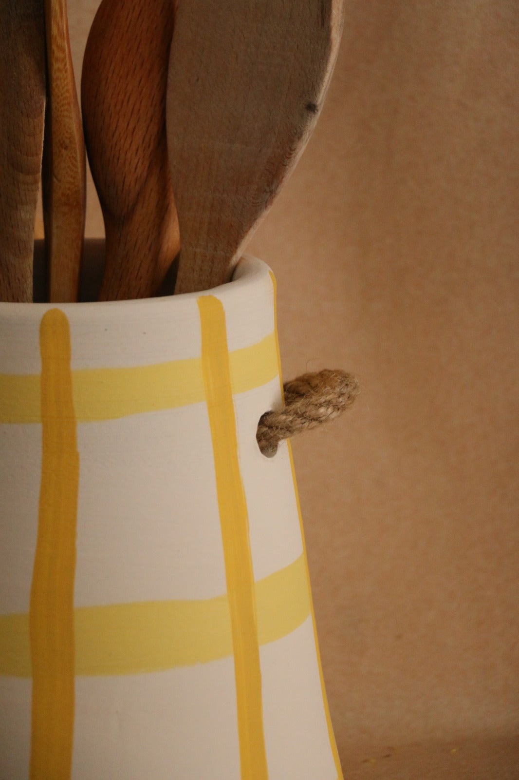 Büyük Boy Hasır Kulp Detaylı Çizgili El Yapımı Dekoratif Vazo & Kaşıklık