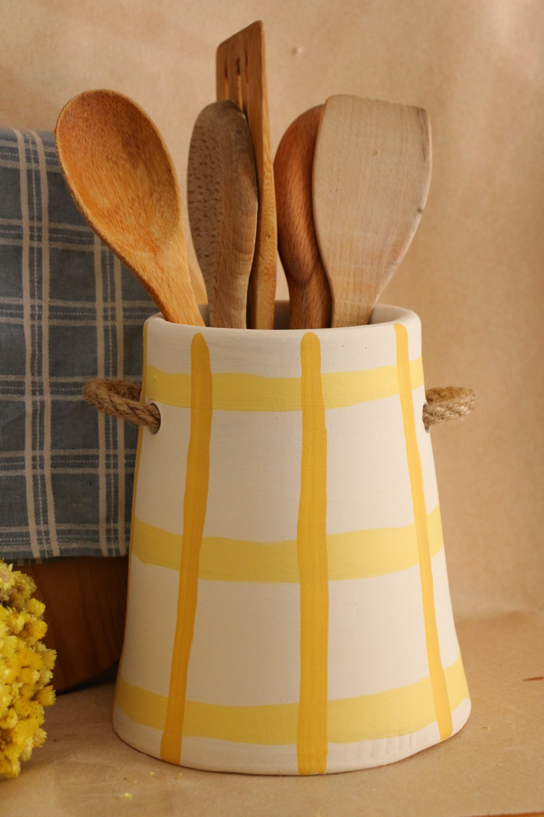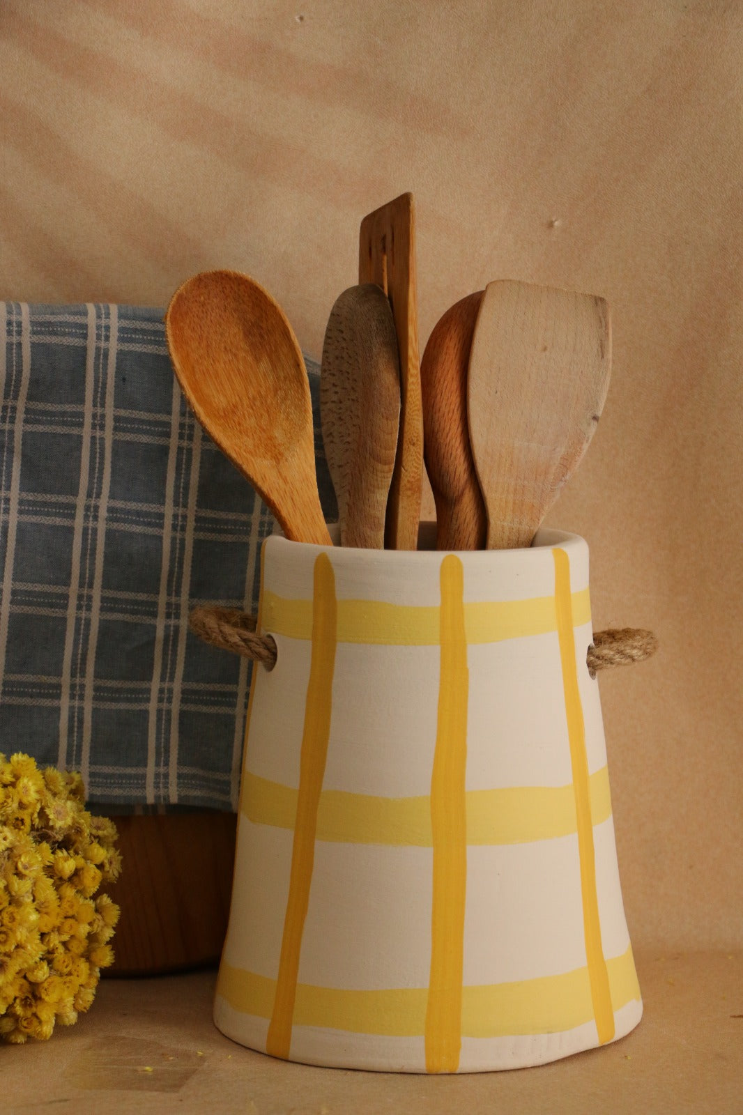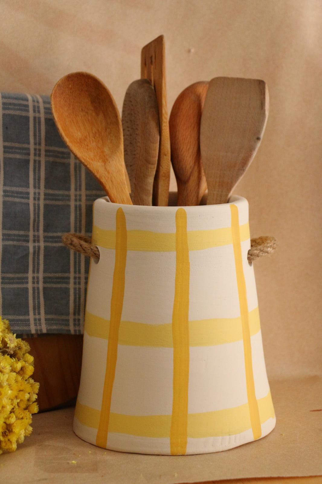 Büyük Boy Hasır Kulp Detaylı Çizgili El Yapımı Dekoratif Vazo & Kaşıklık