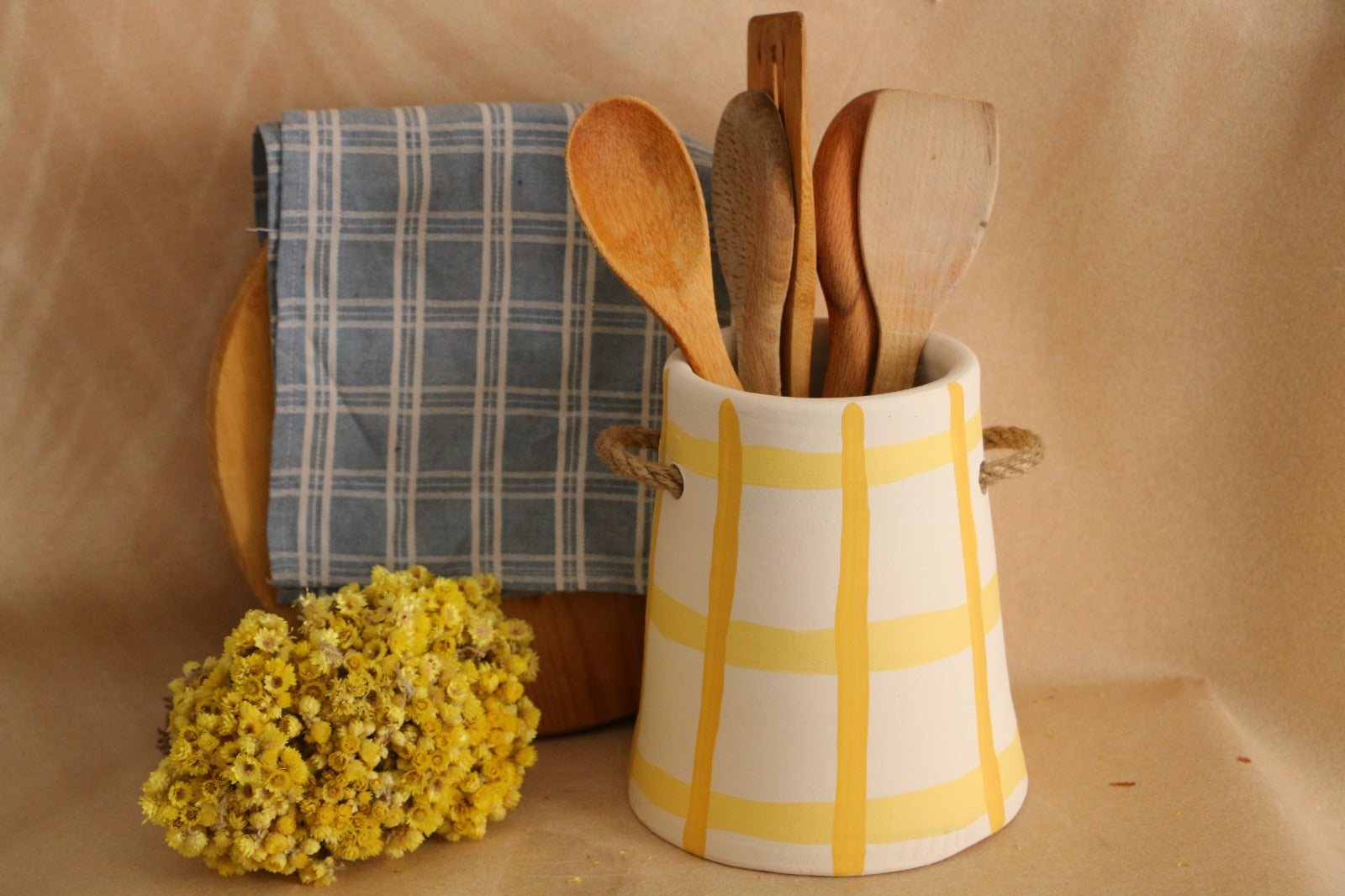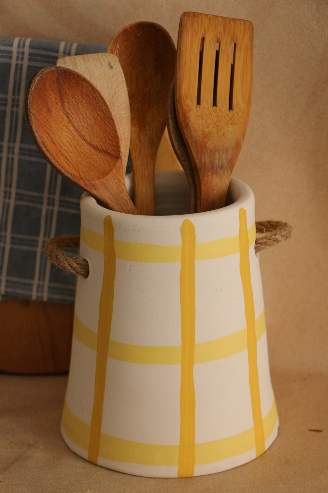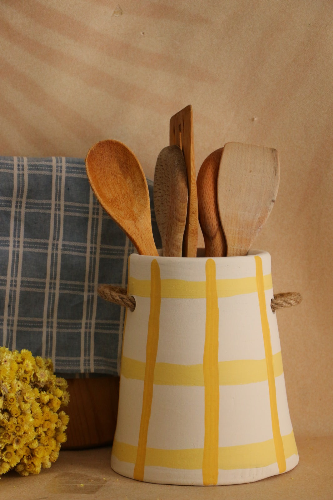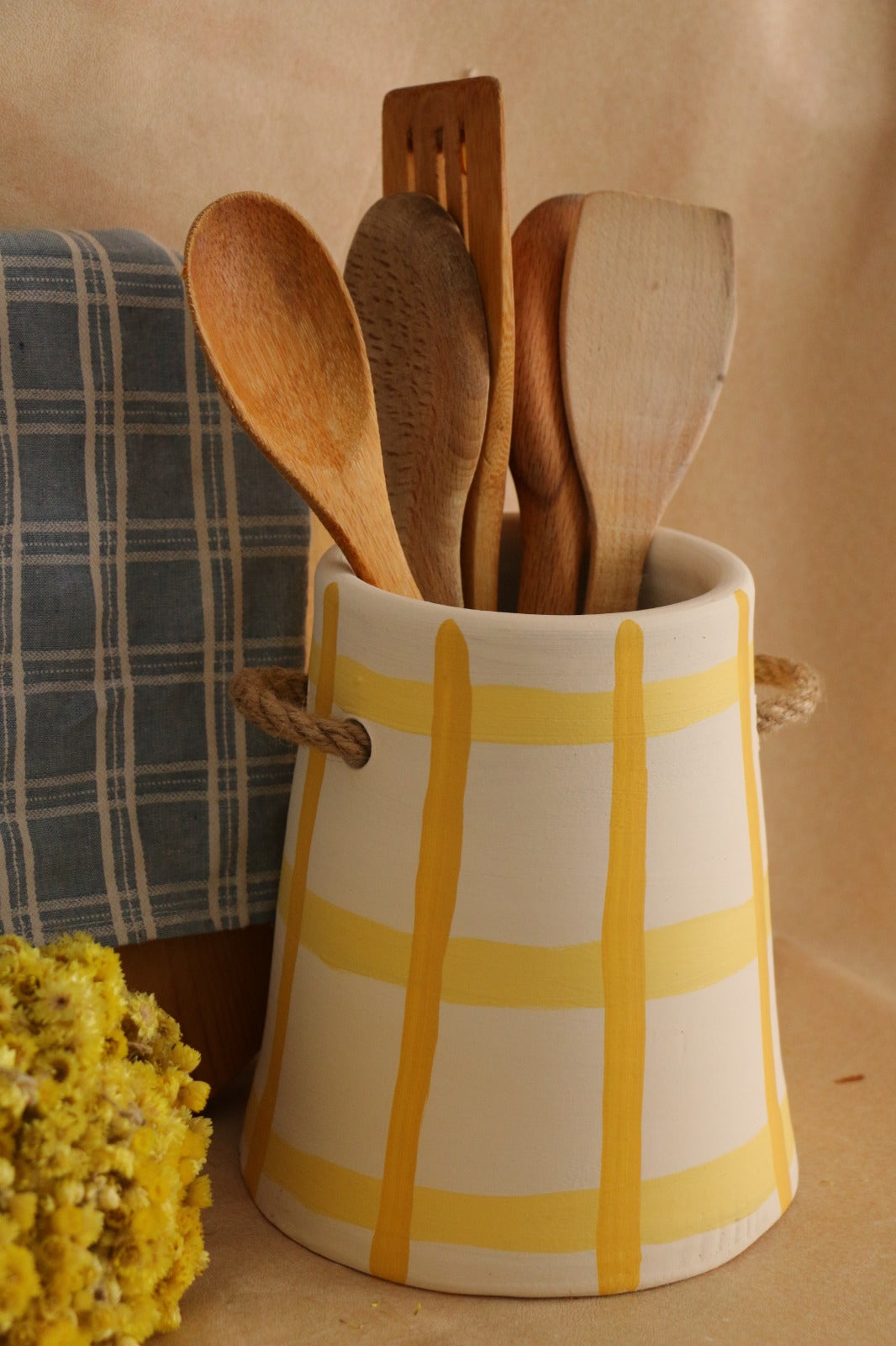 Büyük Boy Hasır Kulp Detaylı Çizgili El Yapımı Dekoratif Vazo & Kaşıklık