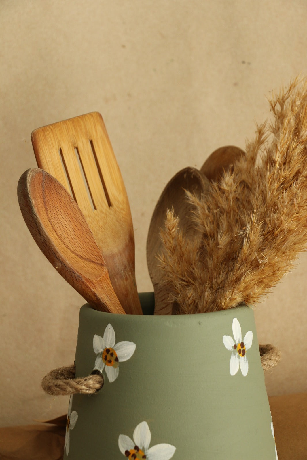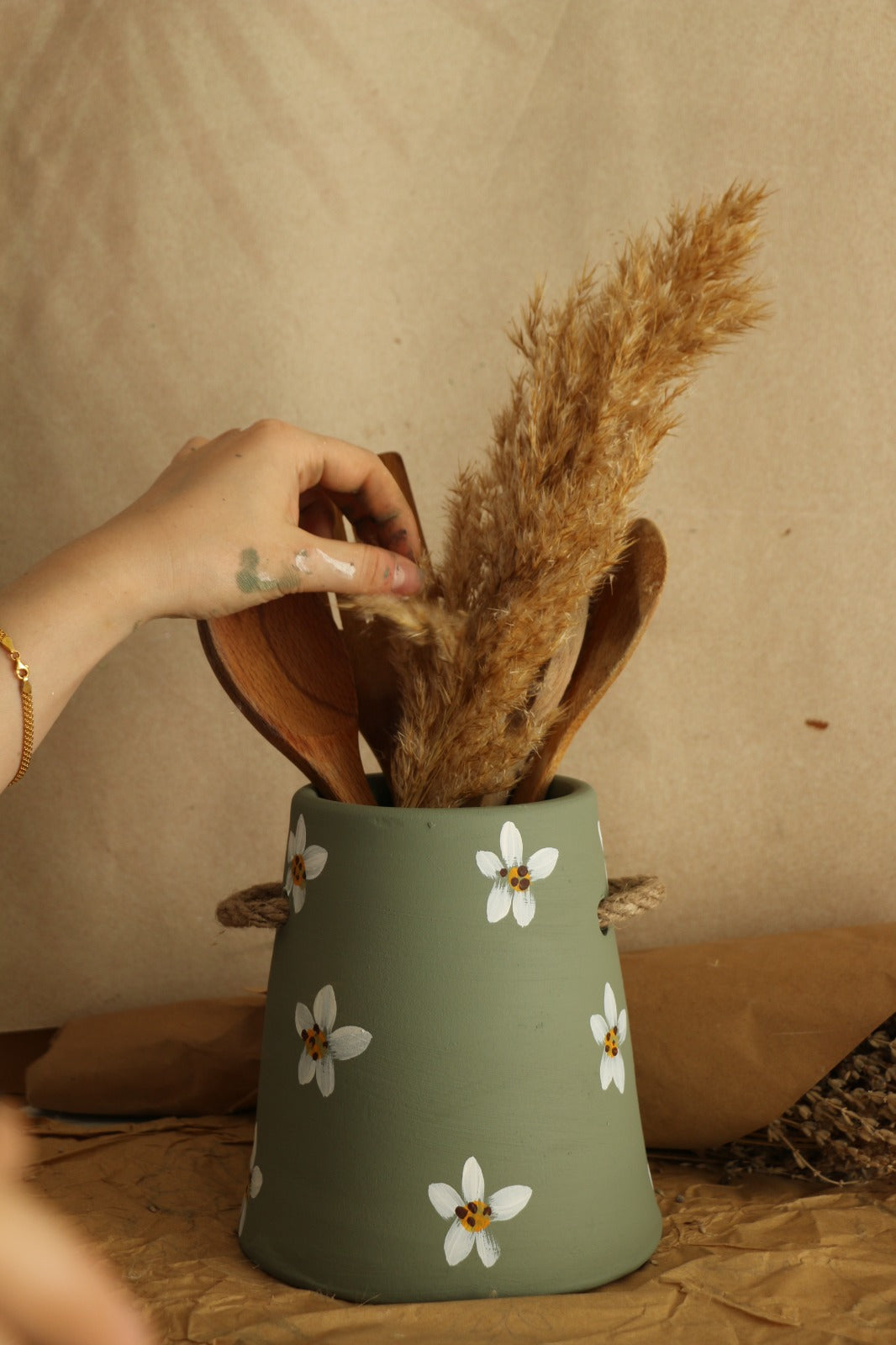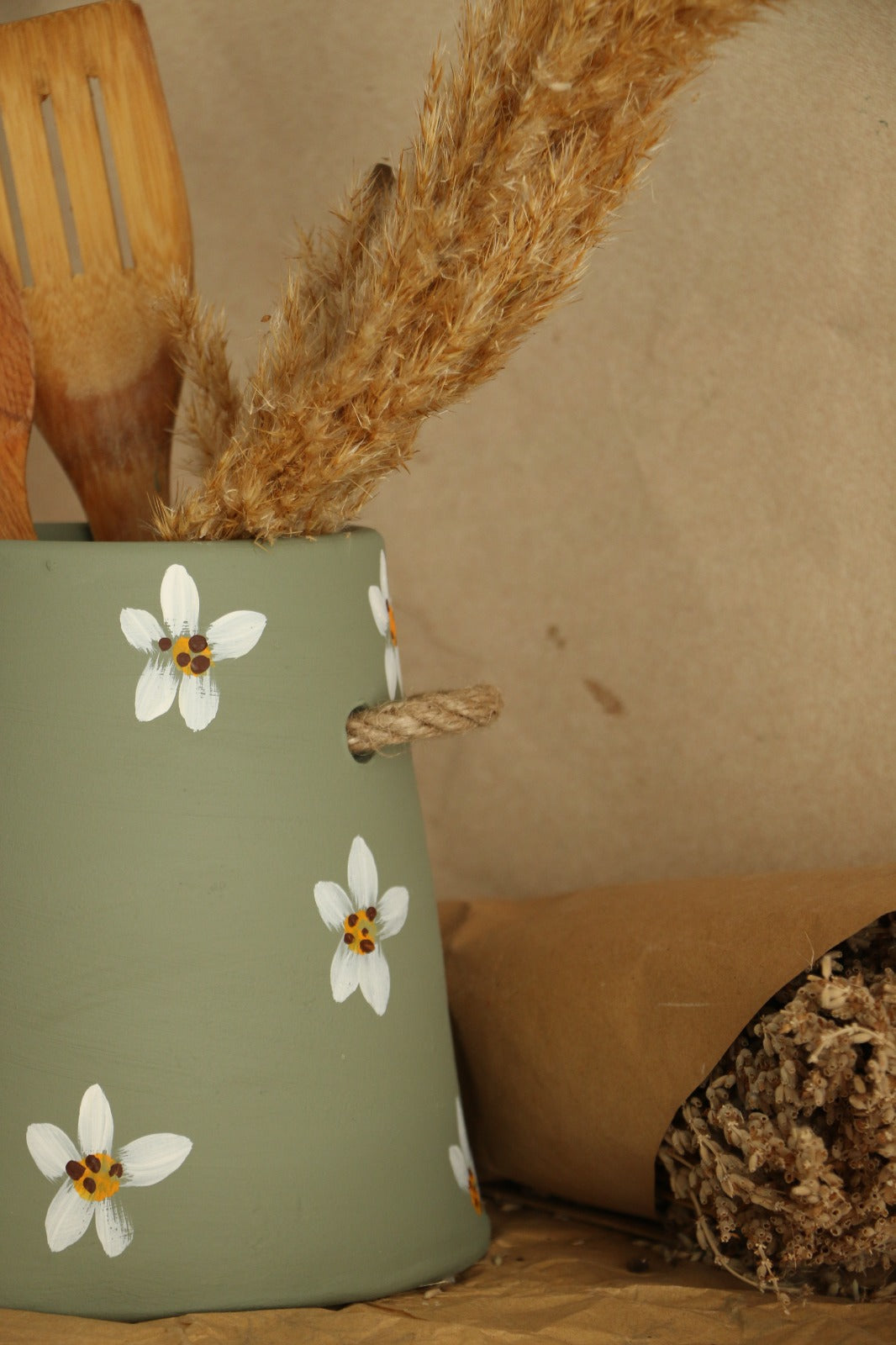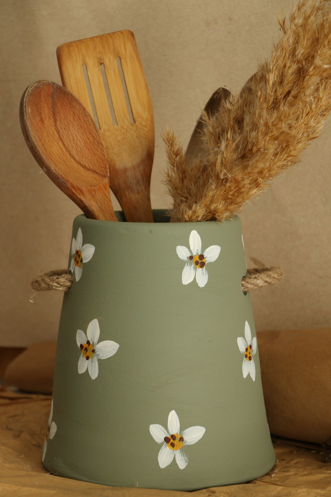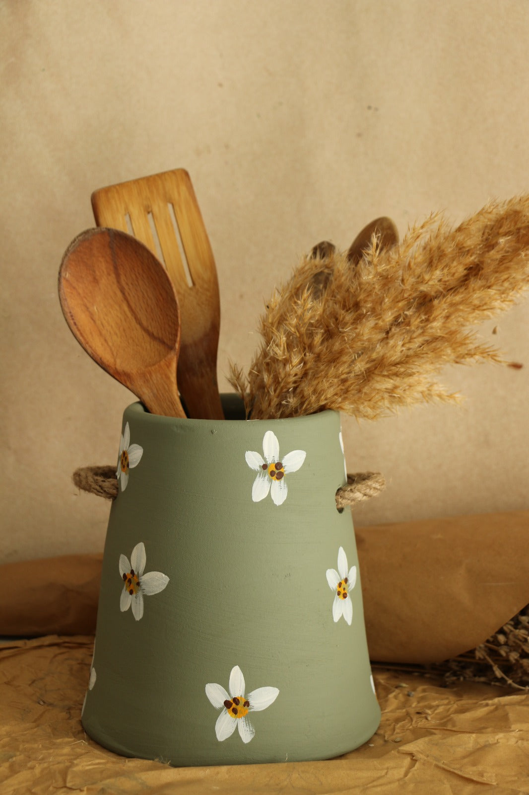 Büyük Boy Hasır Kulp Detaylı Papatyalı El Yapımı Dekoratif Vazo & Kaşıklık
