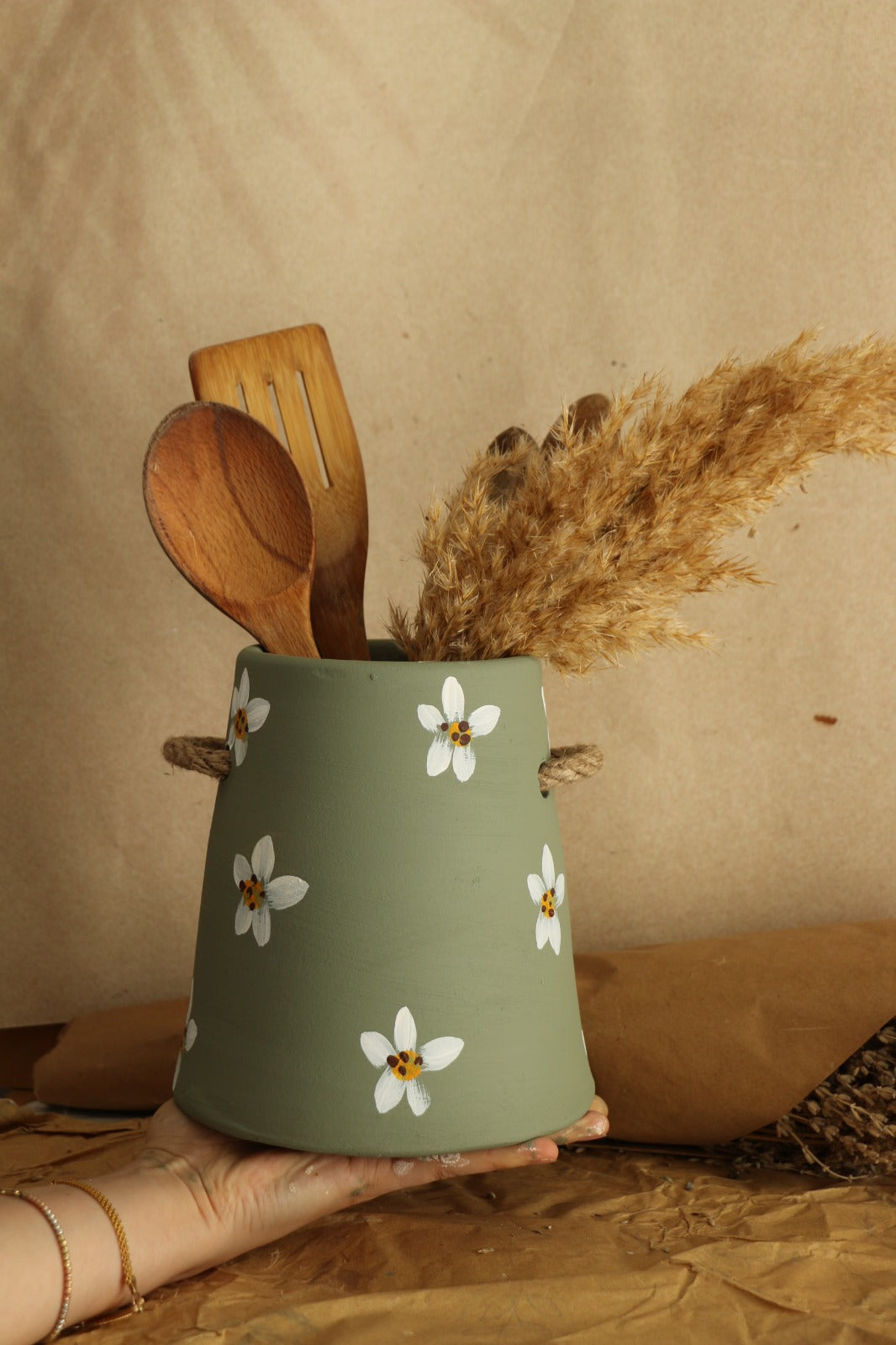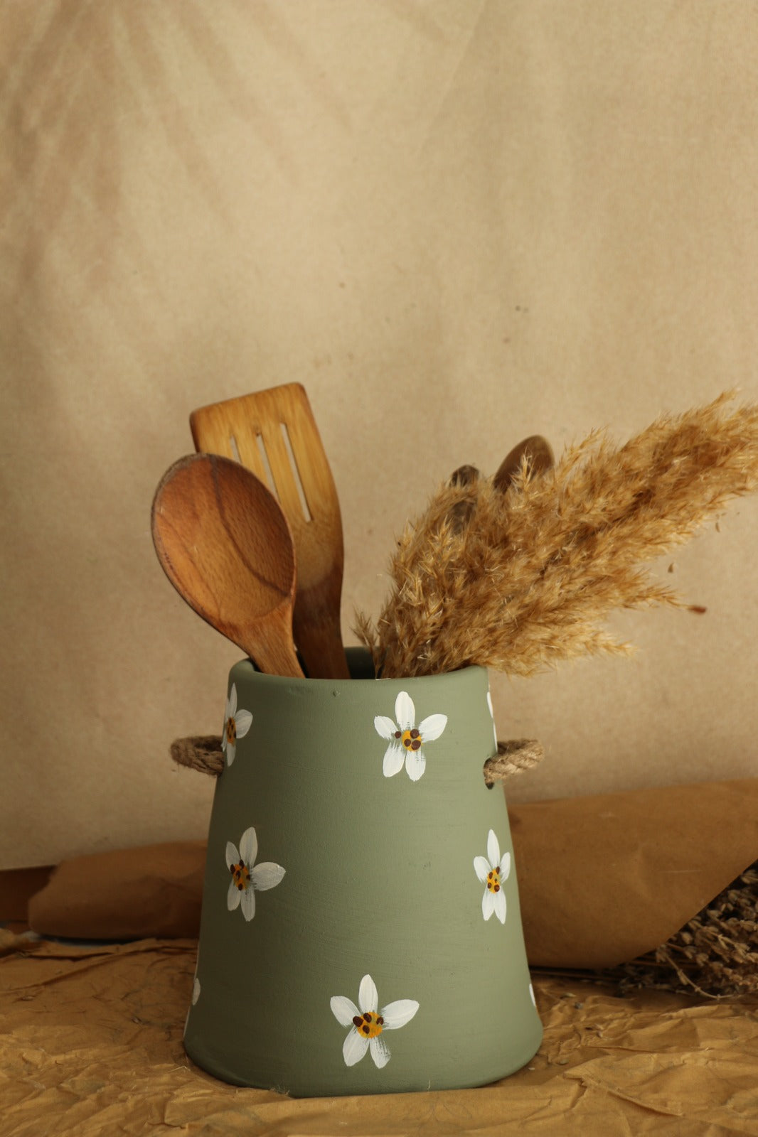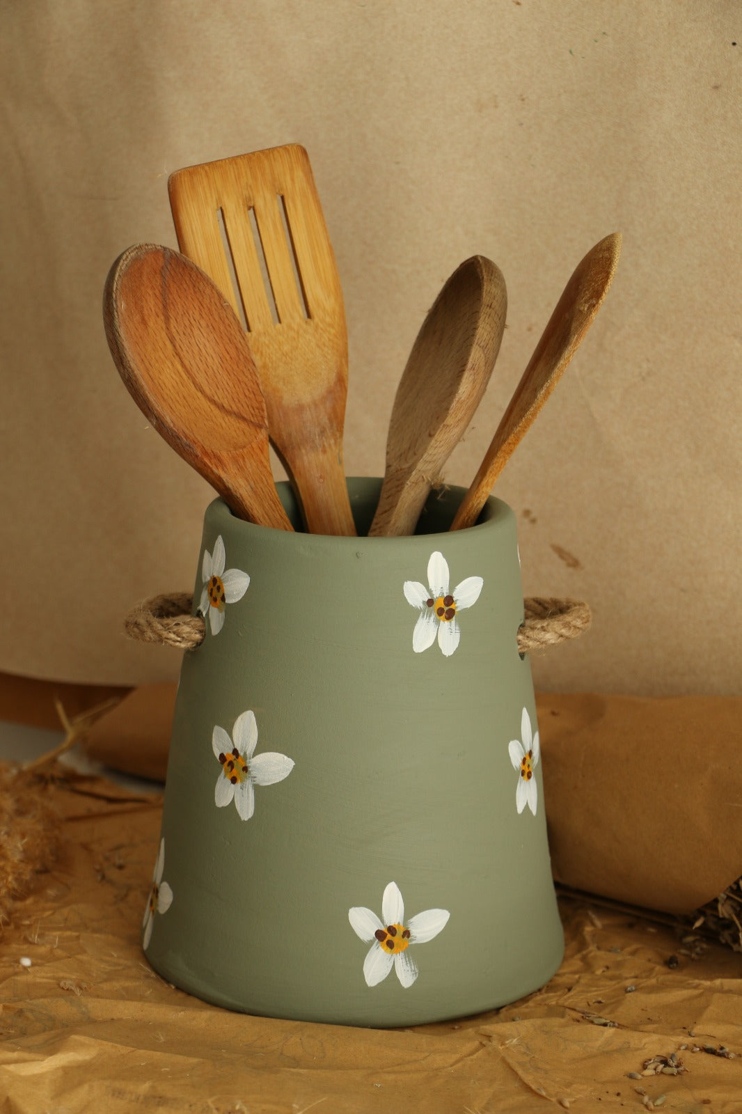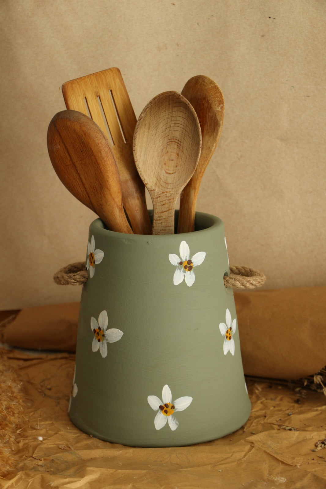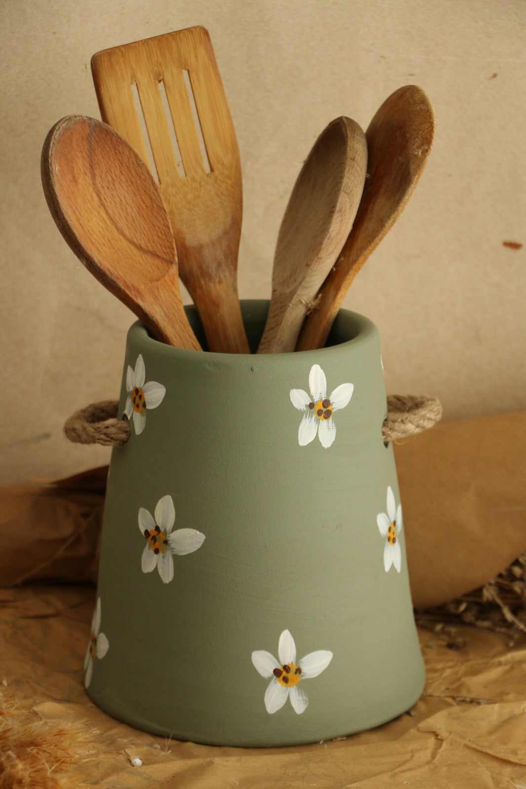 Büyük Boy Hasır Kulp Detaylı Papatyalı El Yapımı Dekoratif Vazo & Kaşıklık