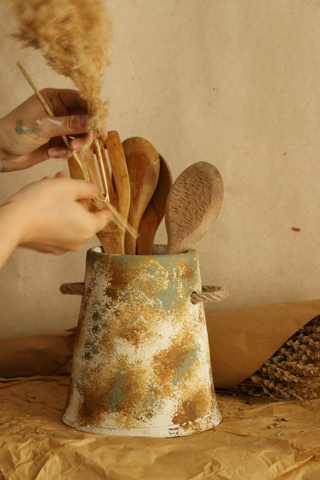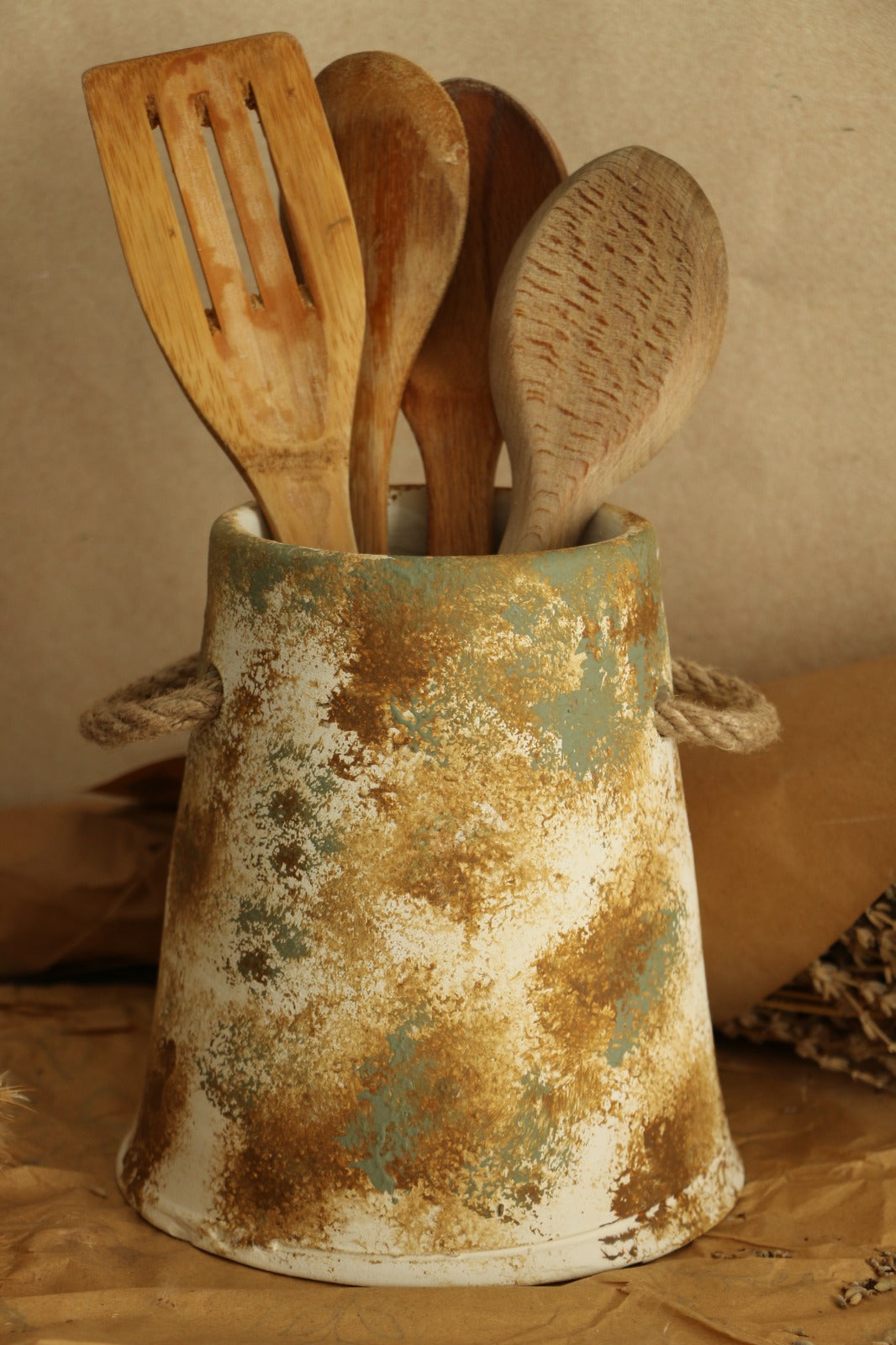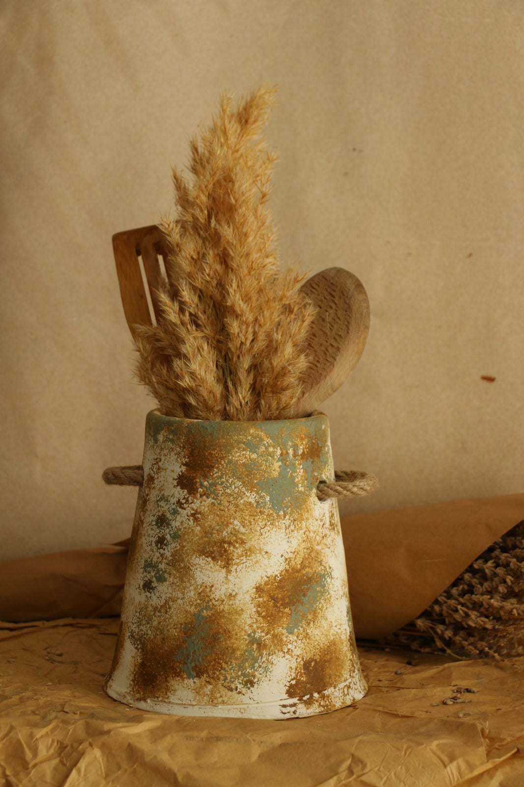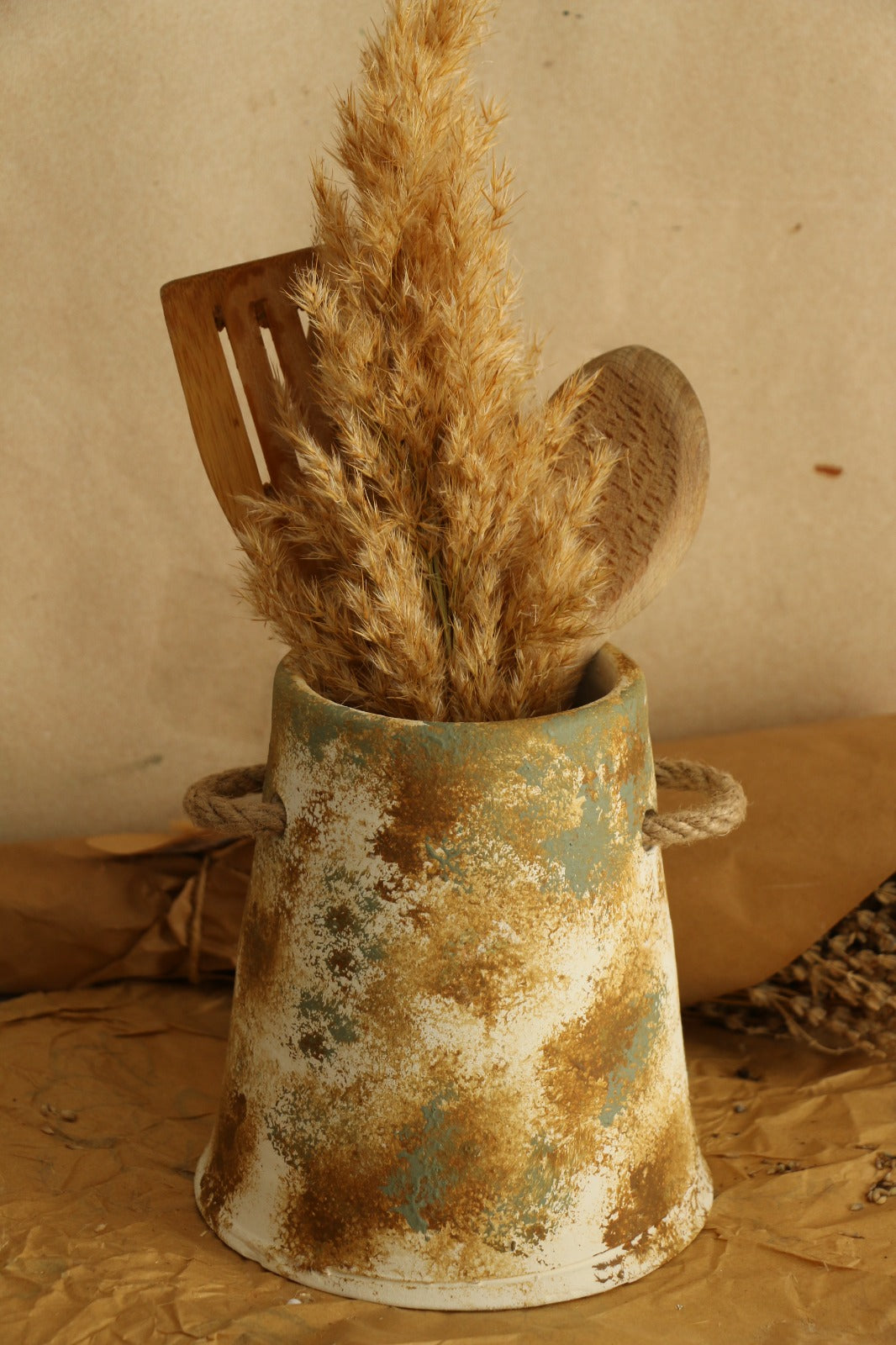 Eskitme Büyük Boy Hasır Kulp Detaylı Kahve Çizgili El Yapımı Dekoratif Vazo & Kaşıklık