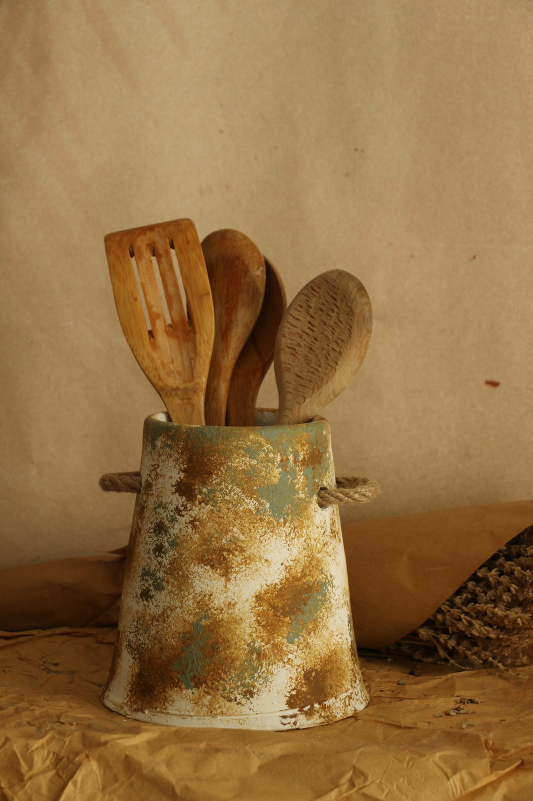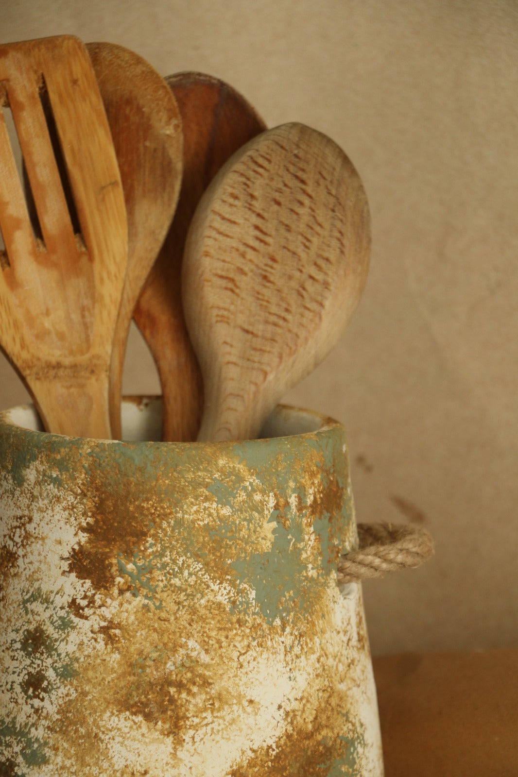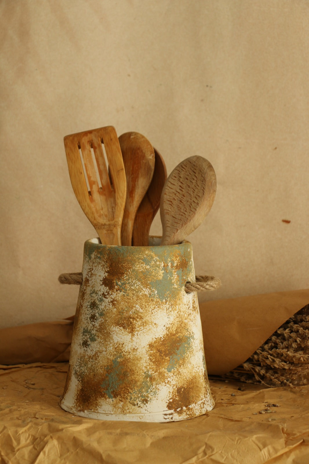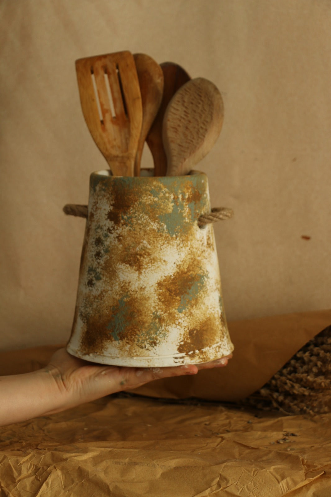 Eskitme Büyük Boy Hasır Kulp Detaylı Kahve Çizgili El Yapımı Dekoratif Vazo & Kaşıklık